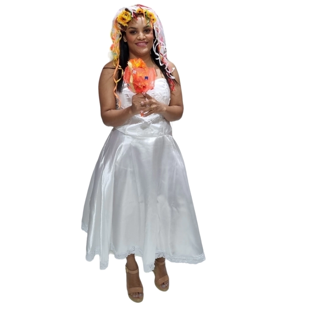 Características: Vestido modelo longo sem manga com detalhe de rosa bordada na parte da frente e renda na barra, abertura nas costas em zíper, possui uma faixa da cintura na cor vermelha para ajuste. Tiara com véu enfeitada de margaridas, girassol e fitas caídas.