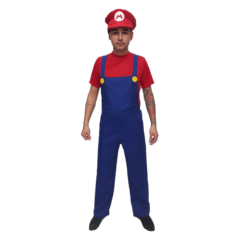 Conteúdo de embalagem: 1 Jardineira, 1 Camiseta e 1 Quepe, 1 par de luvas, 1 bigode.