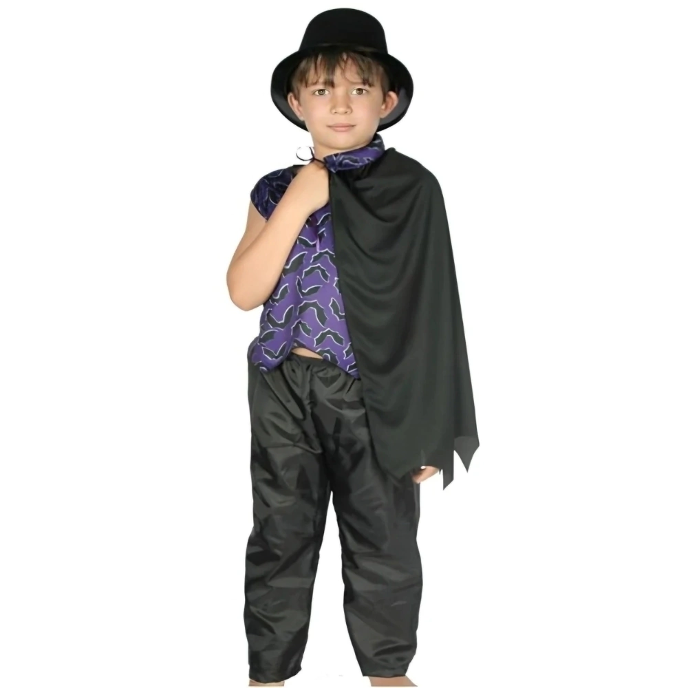 Características: Conjunto Vampirinho Drácula confeccionado no tecido leve e macio, camiseta modelo regata estampada de morceguinhos na parte da frente, calça com elástico na cintura proporcionando conforto, capa curta com gola alta estampada de morceguinhos, possui fitas para amarração.