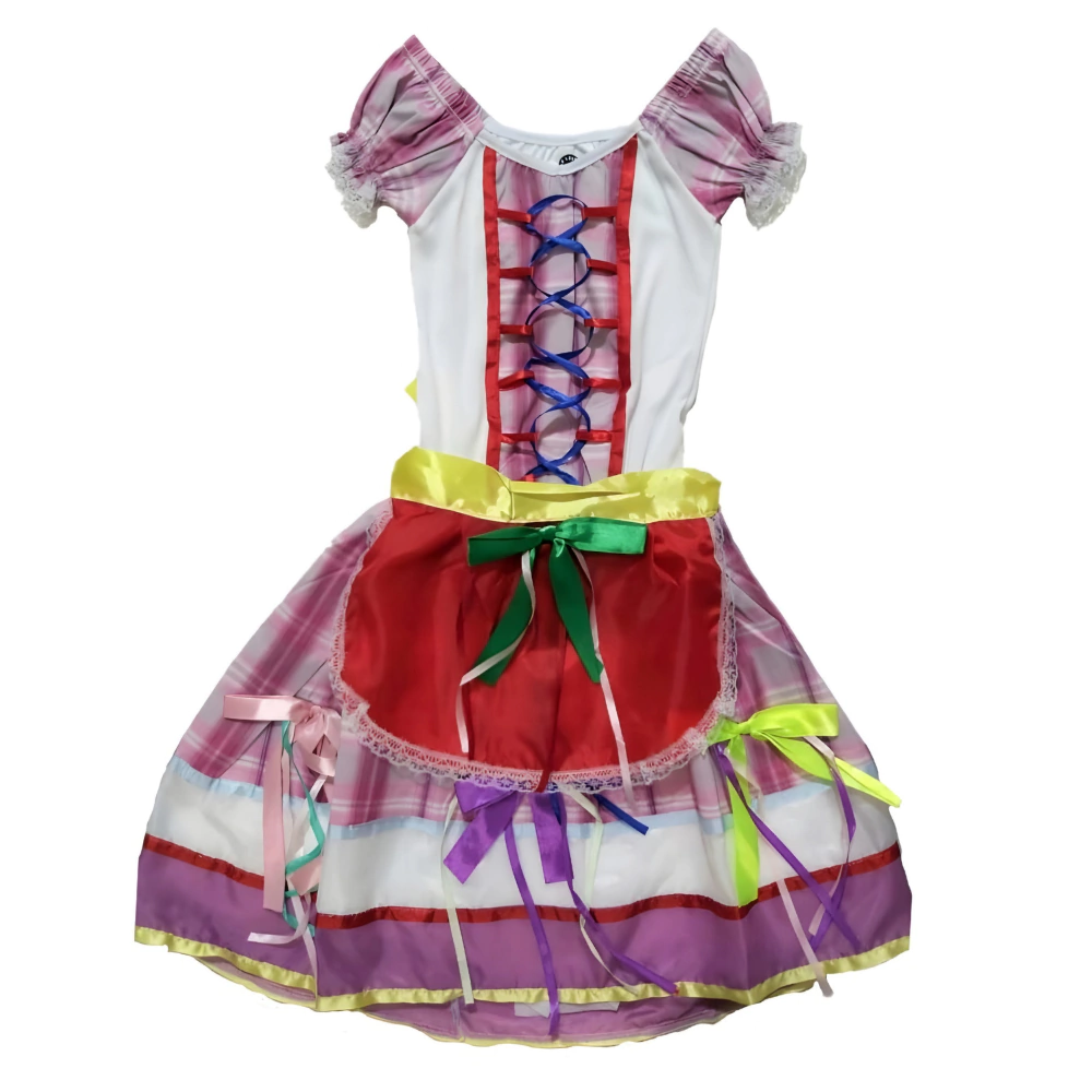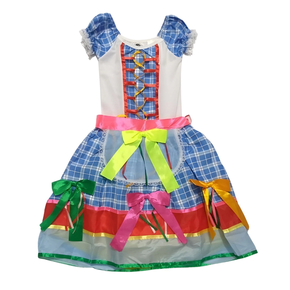Características: Vestido body modelo longo em malha que estica leve e macio com manga curta bufante. Saia voal com elástico na cintura para mais conforto, enfeitada de laços coloridos e avental com fita para ajuste.